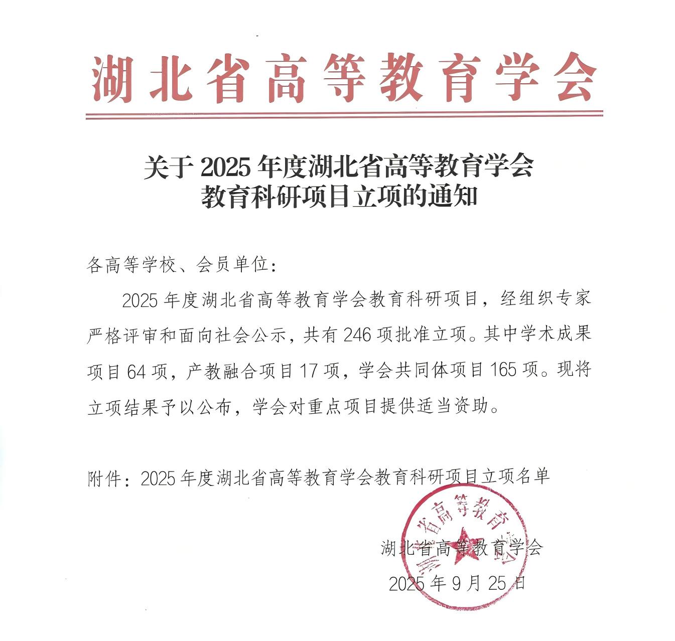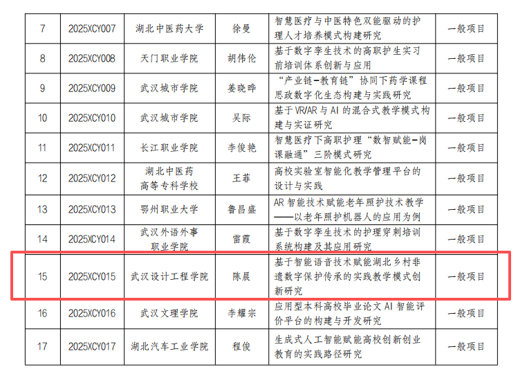 据悉,此次湖北省高等教育学会公布的全省获批产教融合专项课题的仅17项,陈晨老师的项目凭借“技术落地性强、文化价值突出、产教协同紧密”的综合优势成功入选,以独特的创新视角和扎实的实践基础位列其中,彰显了学校在“科技+文化”融合教育领域的卓越实力。