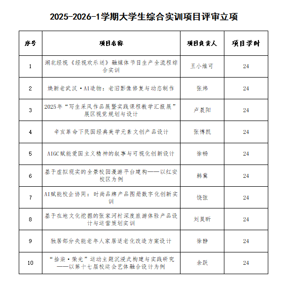 学校依据评审标准,组织专家对申报项目进行了认真评审。经审议,现拟推荐“湖北经视《经视欢乐送》融媒体节目生产全流程综合实训”等10个项目为2025-2026学年第一学期综合性实训立项项目,现予以公示。