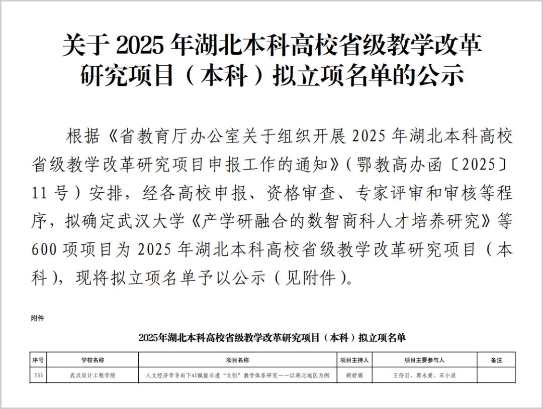 本网讯(通讯员 韩洁)12月10日,湖北省教育厅公示了2025年本科高校省级教学改革研究项目(本科)拟立项名单,我校时尚设计学院胡舒娟老师申报的《人文经济学导向下AI赋能非遗“文创”教学体系研究——以湖北地区为例》项目获批省级立项。